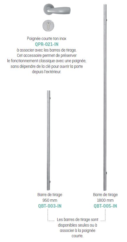 - (15) Poignée de tirage ton inox (ouverture à la clé) QPP-020-IN et QPP-025-IN. Compatible avec serrure motorisée