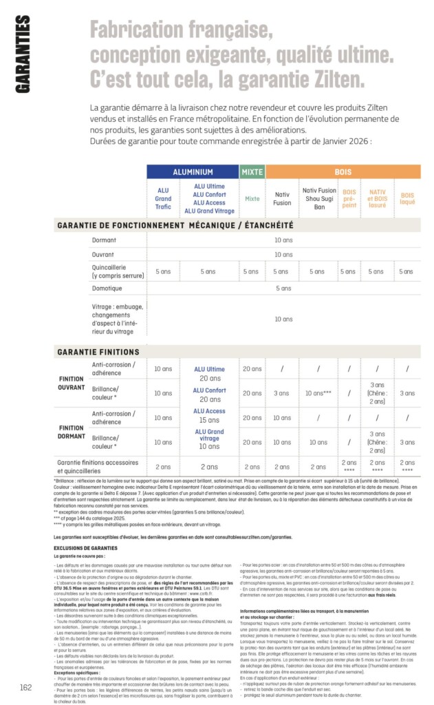 Nos innovations constantes permettent d’améliorer régulièrement les durées de nos garanties. Vous trouverez ci-dessous le dernier tableau de garantie concernant les portes livrées à nos revendeurs partenaires à partir du 1ᵉʳ janvier 2026. La garantie sur les portes Zilten commence à compter de la date de livraison chez notre revendeur partenaire. Le remplacement ou la réparation ne modifiera par le régime de garantie et n’en prolongera pas sa durée.