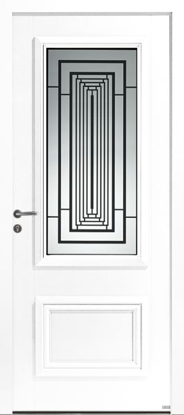 | Décor de base | Porte mi-vitrée à grille avec cadre mouluré et vitrage sablé. Cette grille est de couleur gris RAL 9007 en standard (laquage autre couleur possible en option). Face intérieure identique à la face extérieure. |